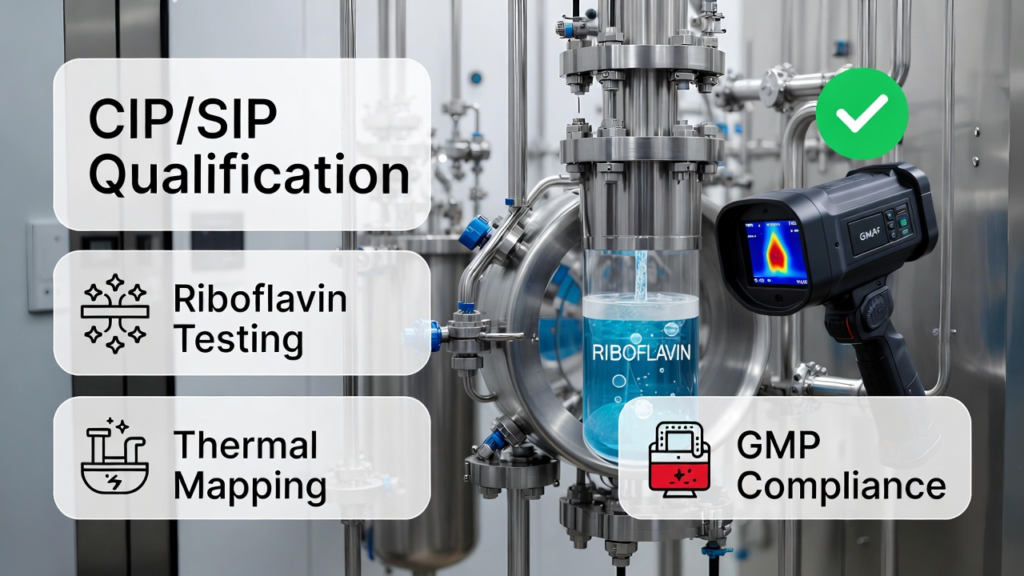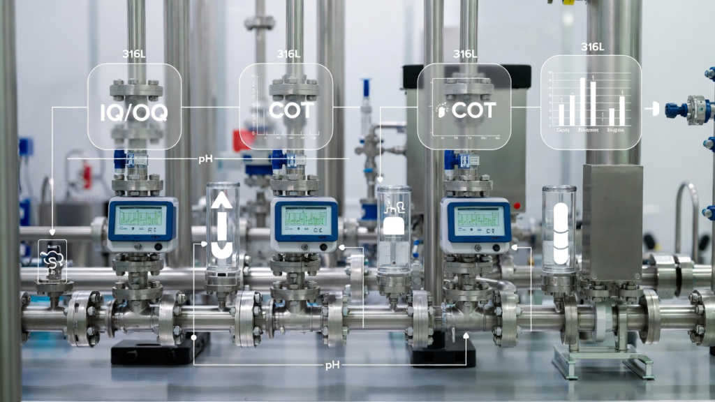 • Vérification de l’Installation (IQ) : Contrôle de la conformité des matériaux (Inox 316L), de la qualité des soudures (vidéoscopie) et vérification de l’absence de bras morts (dead legs).